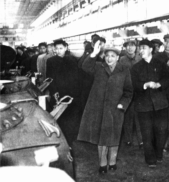 1964年4月8日中共中央总书记邓小平视察617厂时在总装车间向干部职工招手致意