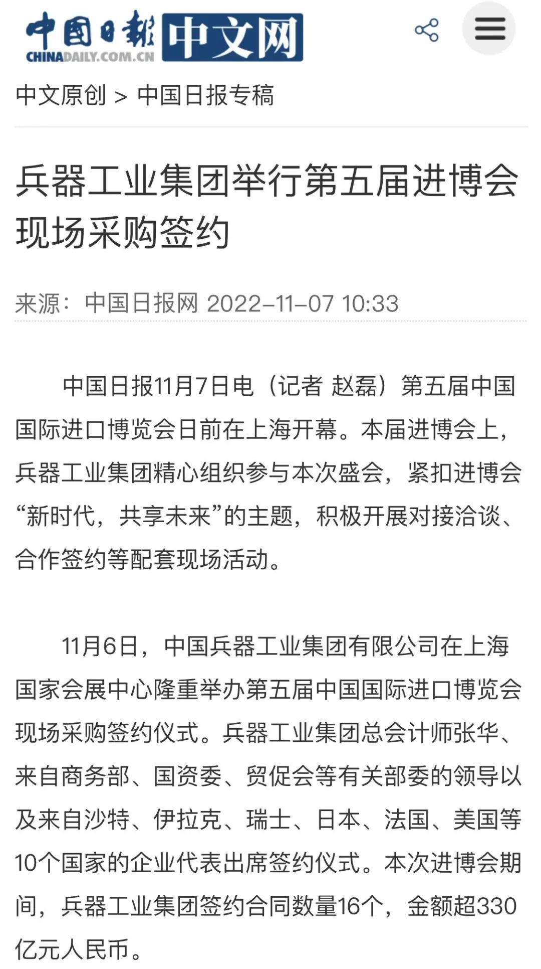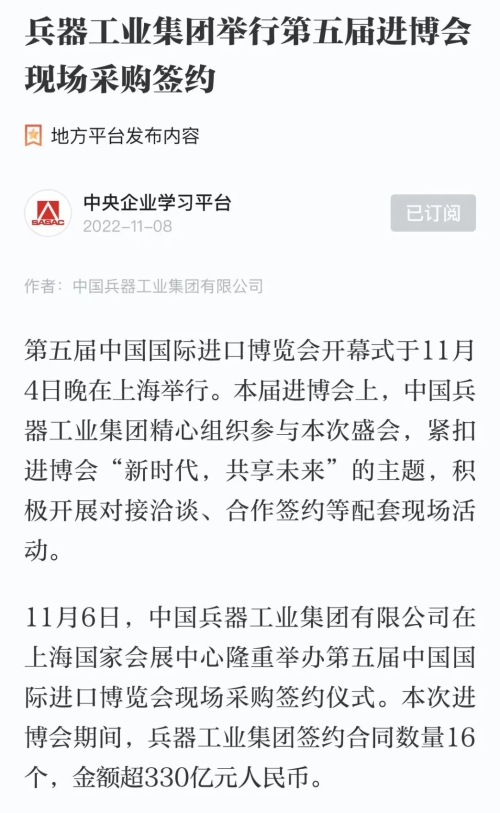 兵器工业集团第五届进博会成果受到广泛关注 |