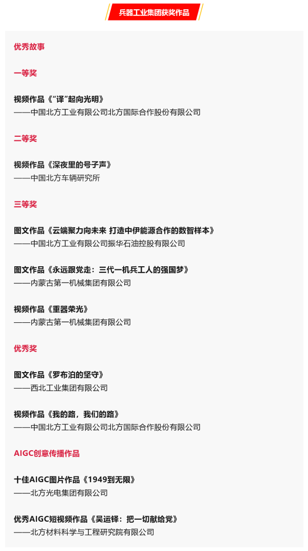 兵器工业集团9件作品在第七届中央企业优秀故事暨AIGC创意传播作品发布展示活动中获奖 |